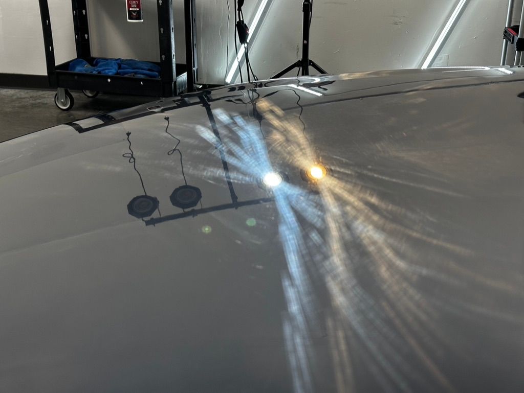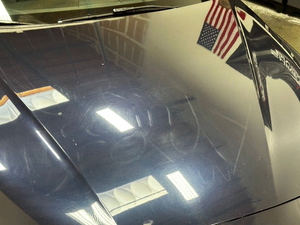 The hood had visible etching in the shape of letters—likely someone writing into the paint over time. To permanently eliminate these defects, we performed a controlled wet sanding process.